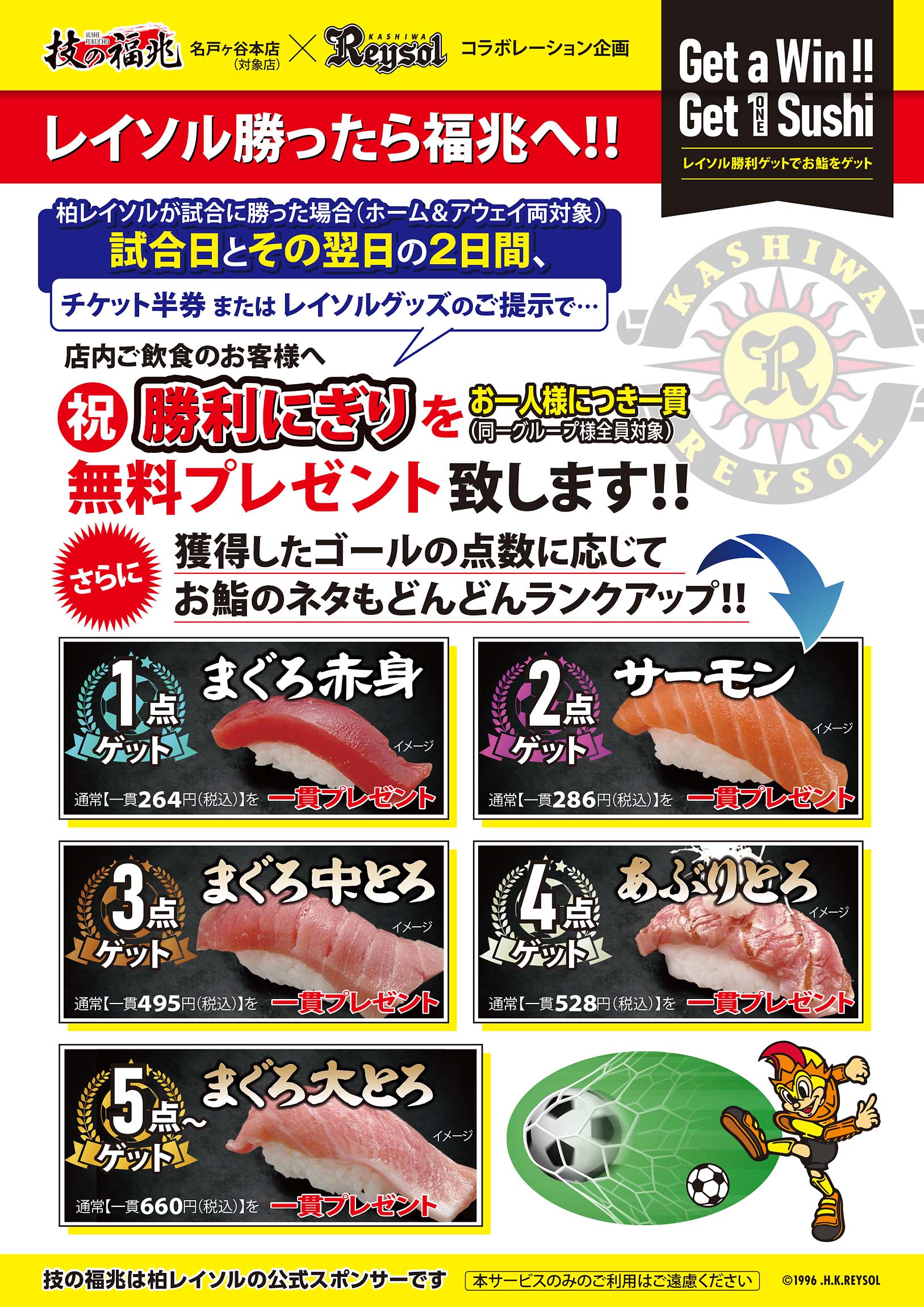 • レイソルが勝ったら福兆のにぎりを一貫プレゼント!!
