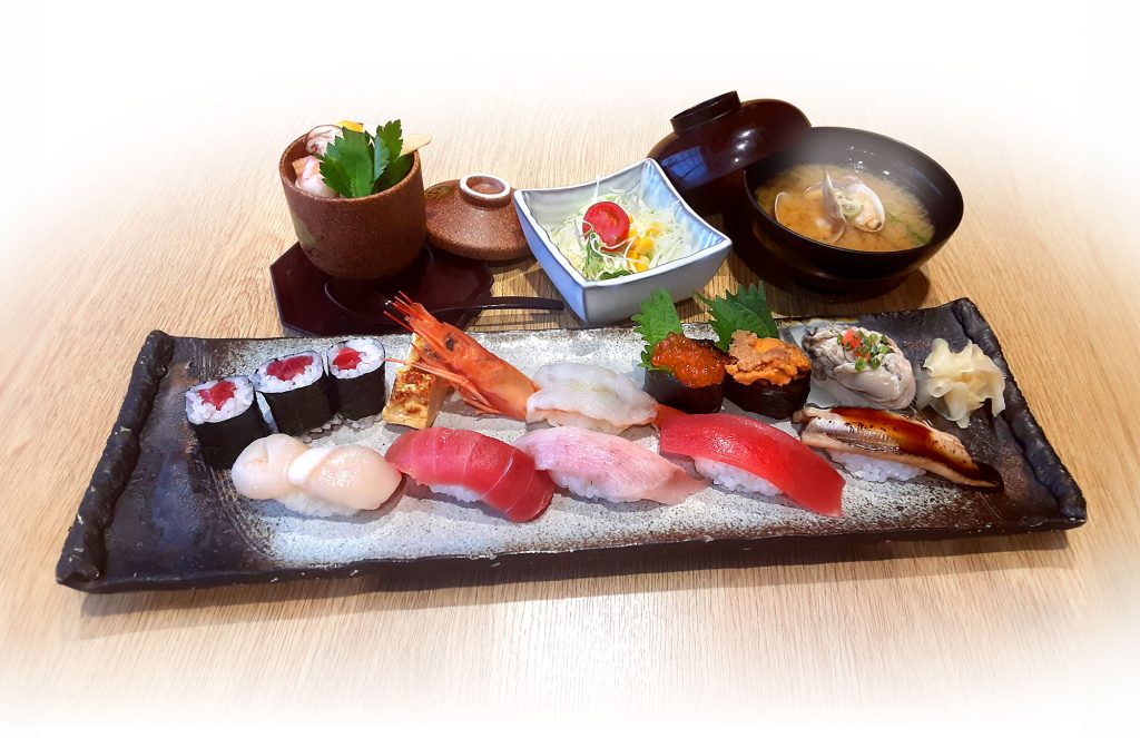 中とろ・サーモン・穴子・本日の白身・巻き物などボリュームたっぷりに盛り込みます